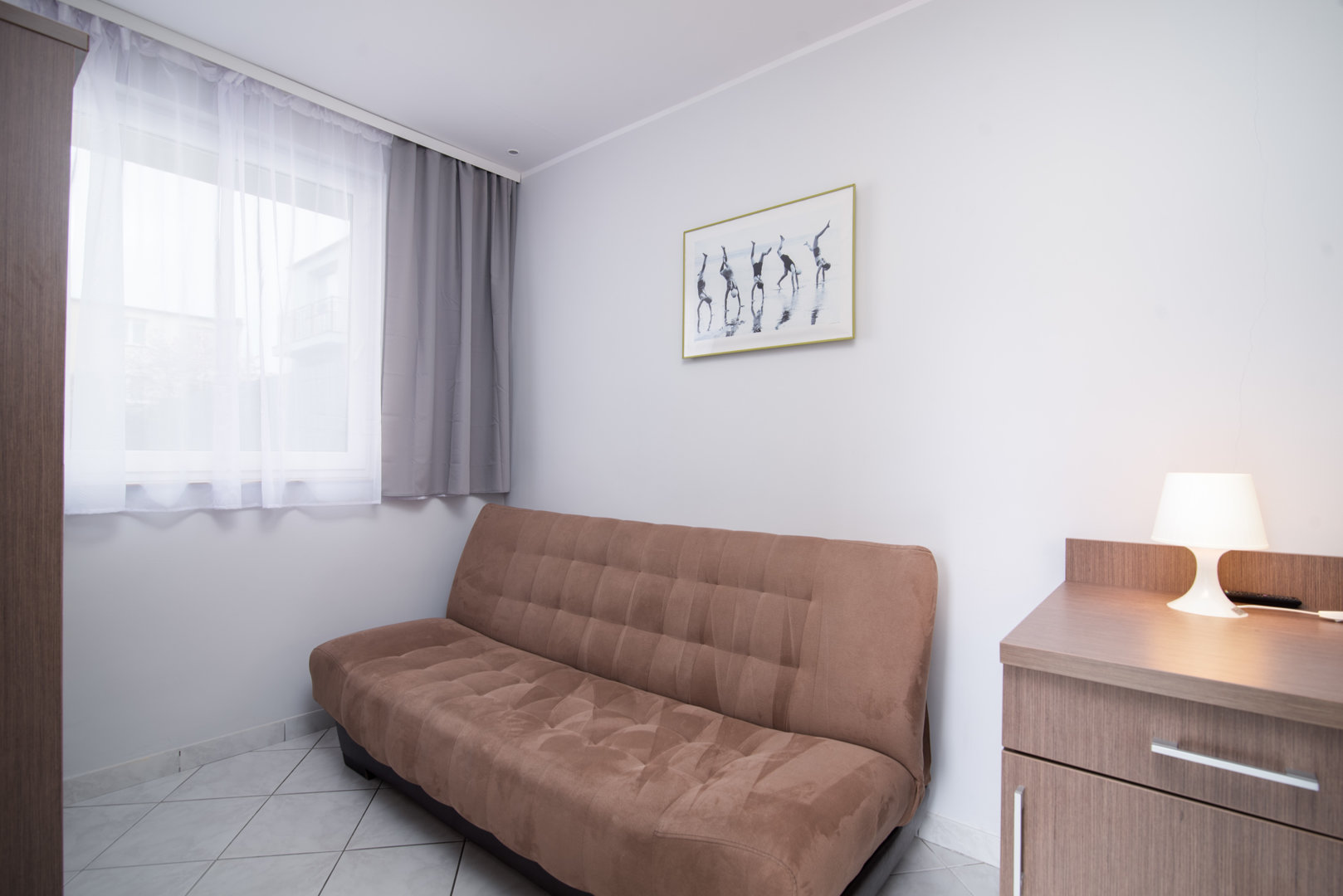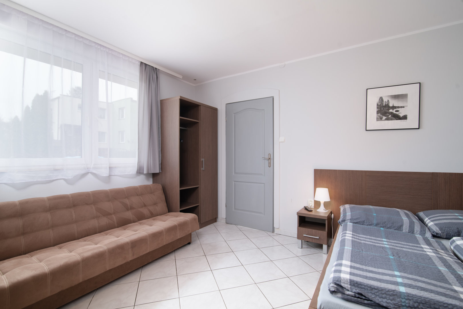 Apartament z dwoma pokojami o pow. 30 m²: pierwszy pokój z wyposażonym aneksem kuchennym i podwójnym łóżkiem 80x200 [po zsunięciu 160x200 cm] jedna sypialnia z dwoma łóżkami pojedynczymi [80X200 cm], które mogą być zestawione jako łóżko małżeńskie [wym.