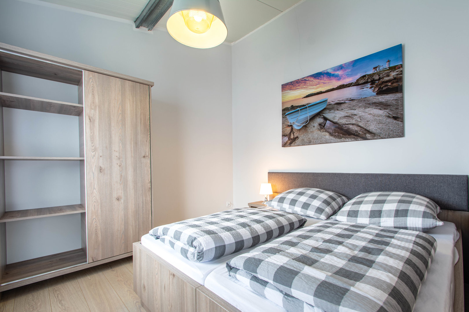 Apartament z dwoma pokojami o pow. 30 m²: pierwszy pokój z wyposażonym aneksem kuchennym i podwójnym łóżkiem 80x200 [po zsunięciu 160x200 cm] jedna sypialnia z dwoma łóżkami pojedynczymi [80X200 cm], które mogą być zestawione jako łóżko małżeńskie [wym.