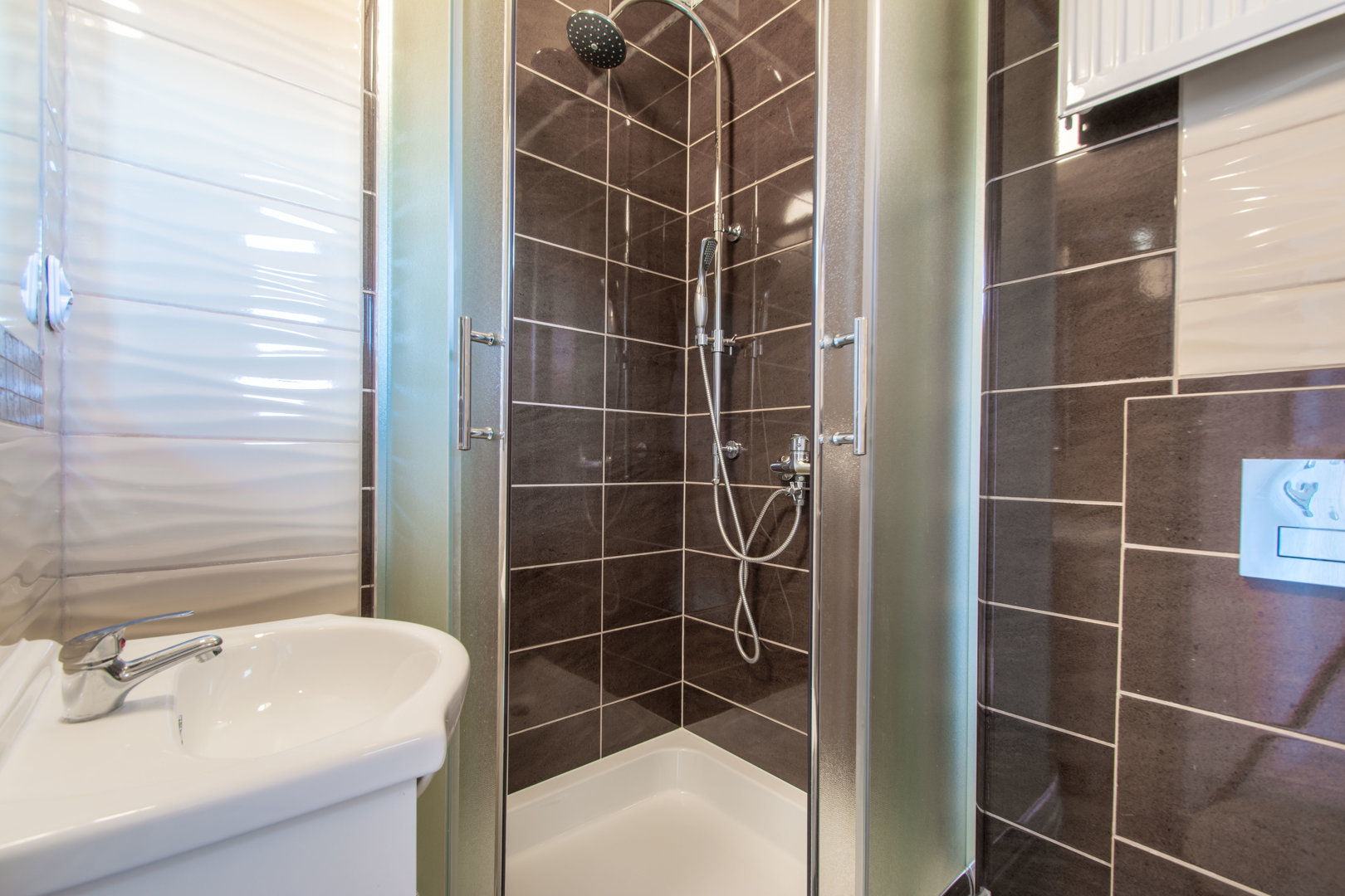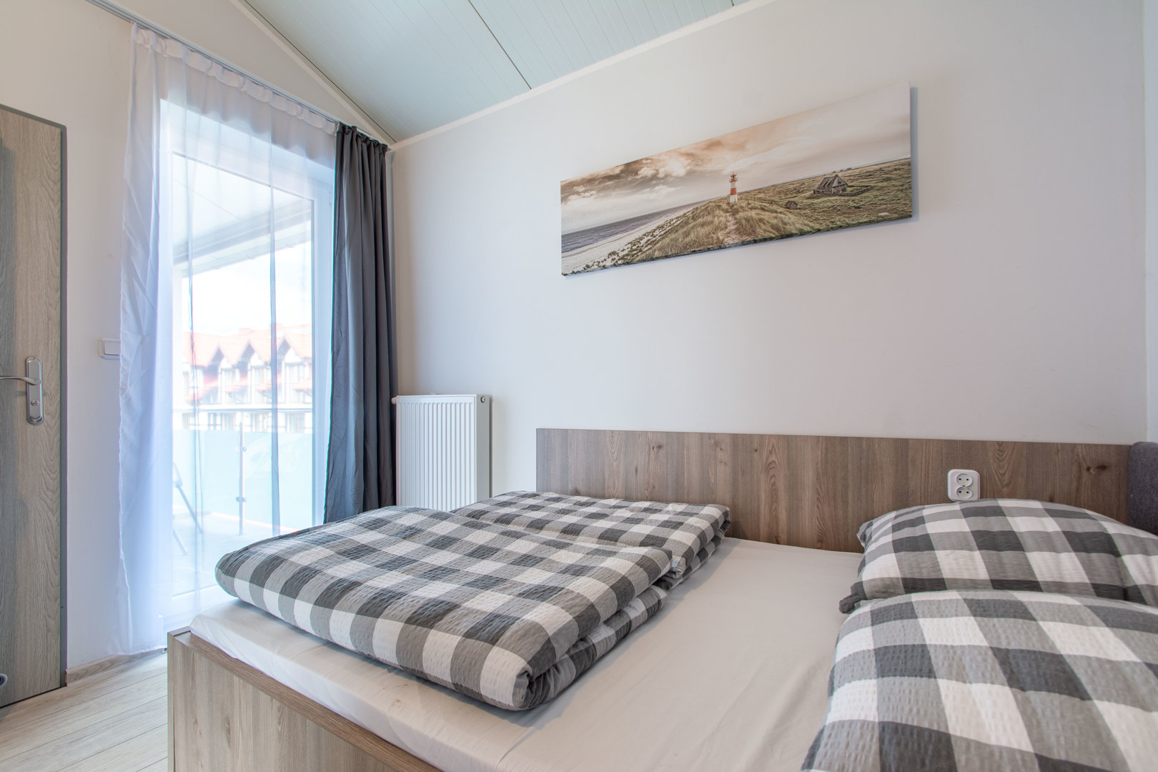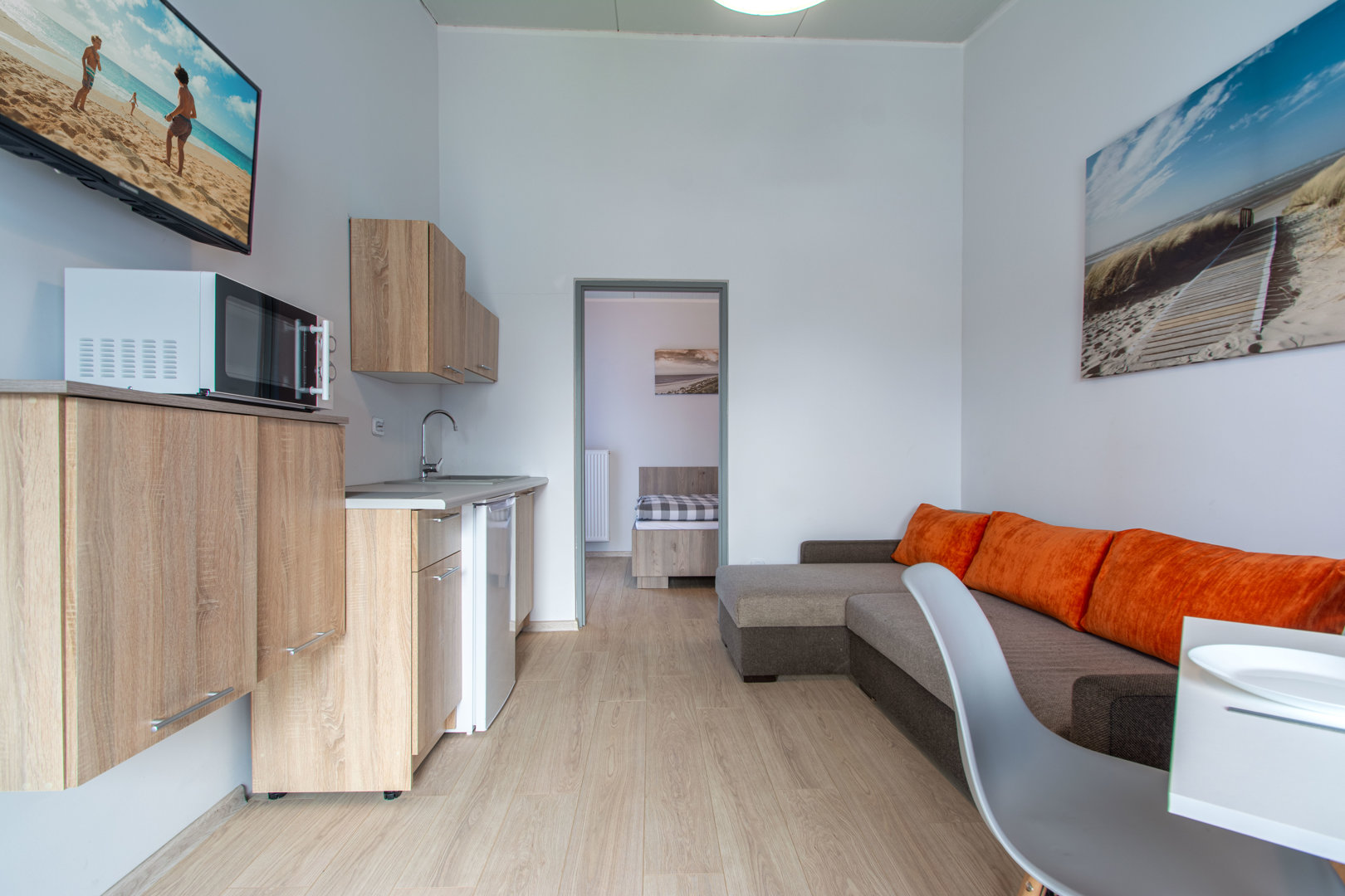 Apartament z dwoma pokojami o pow. 30 m²: pierwszy pokój z wyposażonym aneksem kuchennym i podwójnym łóżkiem 80x200 [po zsunięciu 160x200 cm] jedna sypialnia z dwoma łóżkami pojedynczymi [80X200 cm], które mogą być zestawione jako łóżko małżeńskie [wym.